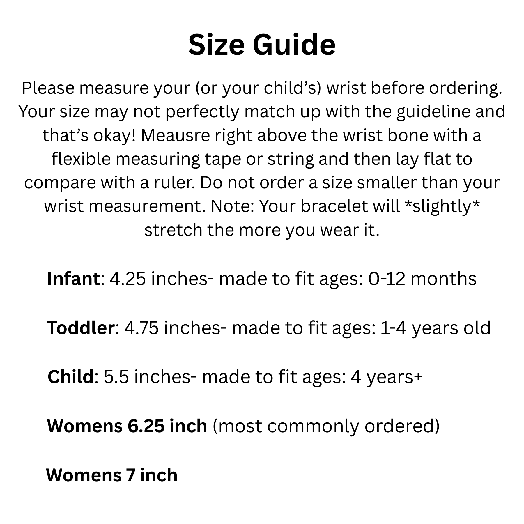 Please note that bracelets are made securely using strong and high quality products, but the nature of a bracelet can be a choking hazard. Please use caution when putting a bracelet on your infant/baby/toddler/young child. It is recommended to remove bracelet(s) while sleeping or when your child is not being watched.